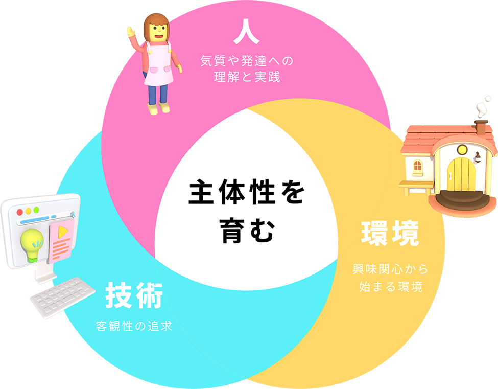 私たちは、人・環境・技術の力で、子どもの興味関心から始まる保育をベースに、子どもたちの主体性を育むことに努めています。